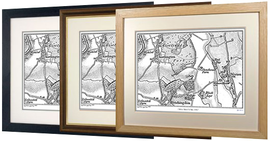 All maps can be selected by postcode or place name. All come in a choice of Deluxe frames with a pale ivory mount. All maps can be personalised by adding your own inscription.